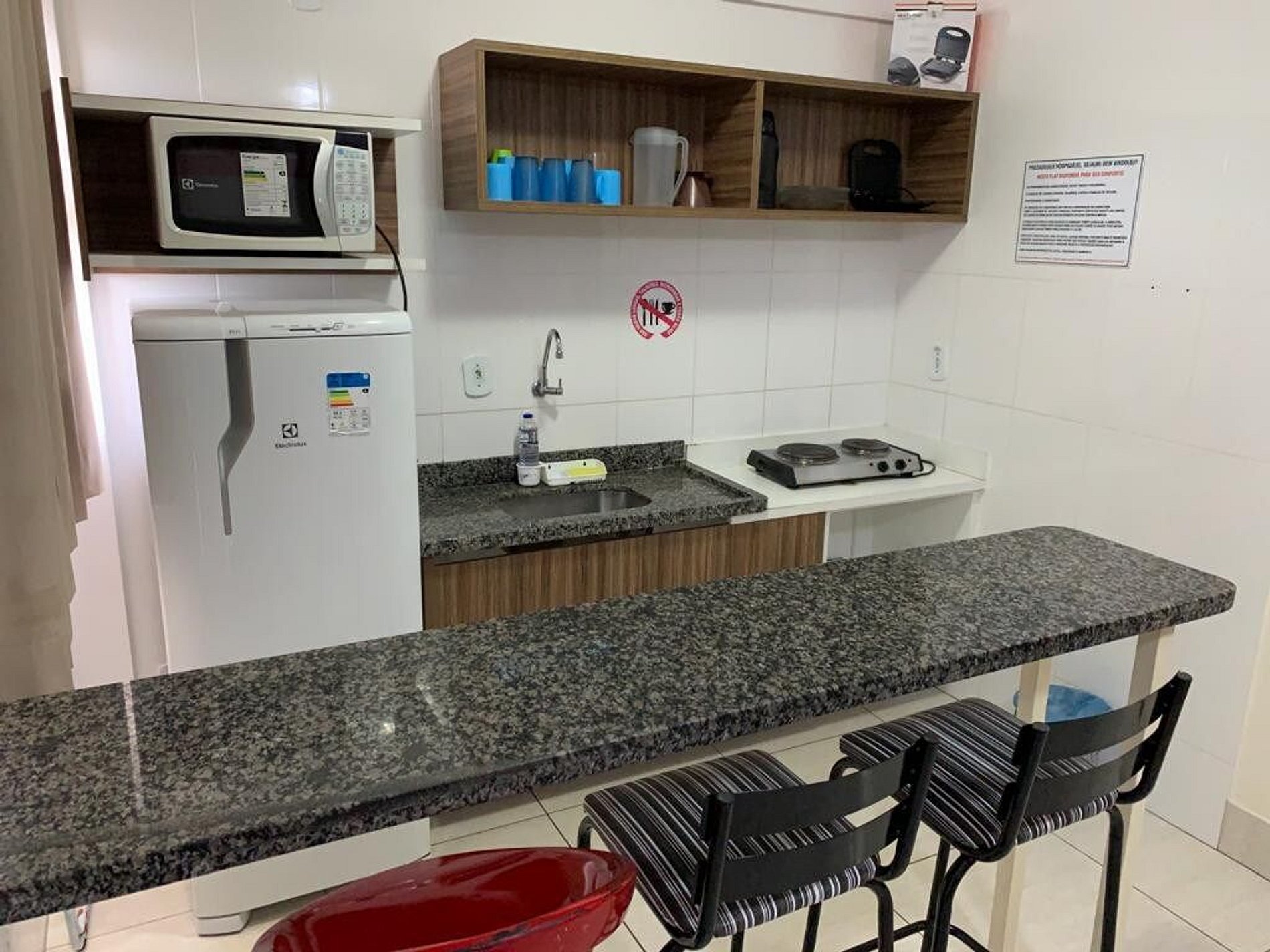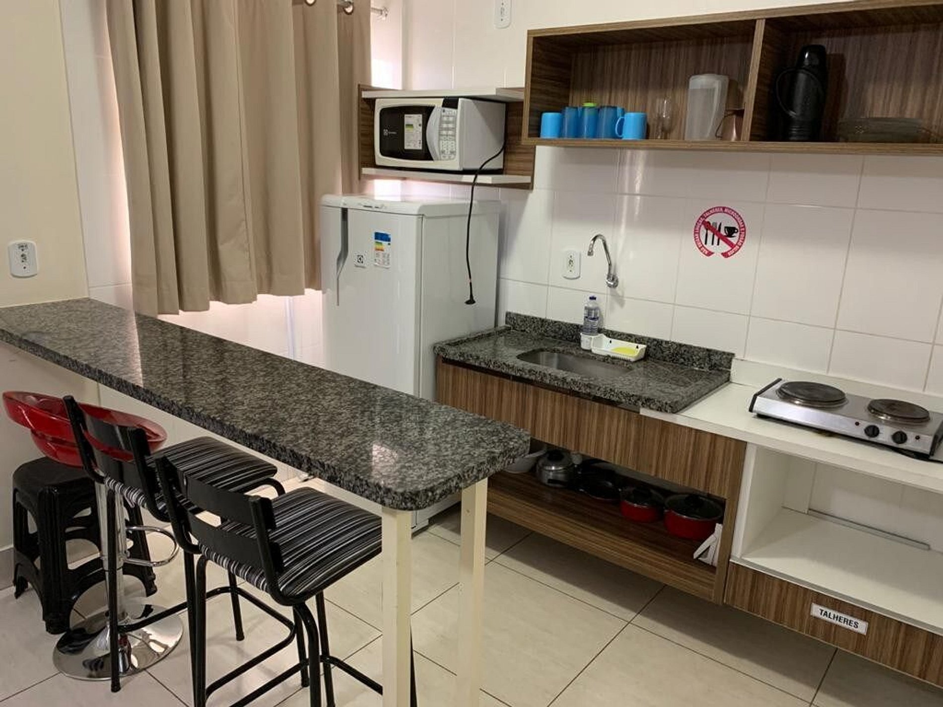 O apartamento conta com 1 cama de casal tamanho Queen no primeiro ambiente, e 1 cama de casal tamanha padrão no segundo ambiente, tv de 32¨, uma mini cozinha com pia, geladeira, fogão elétrico, micro-ondas e utensílios básicos, tudo para preparos rápido ou petiscos . ideal para família ou amigos.