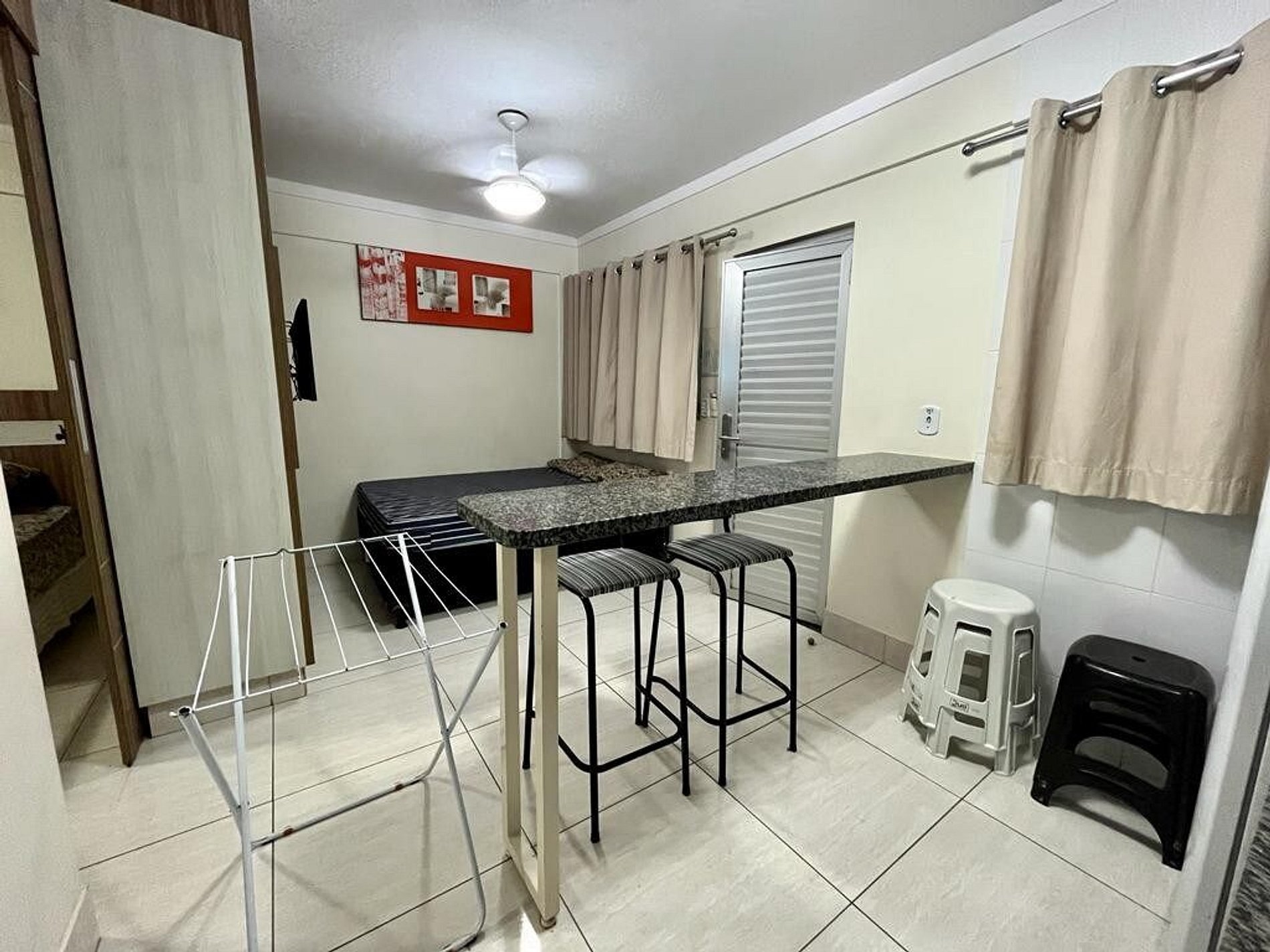 O apartamento conta com 1 cama de casa, ar condicionada no primeiro ambiente e um sofá-cama no segundo, tv de 32¨, uma mini cozinha com pia, frigobar, micro-ondas,