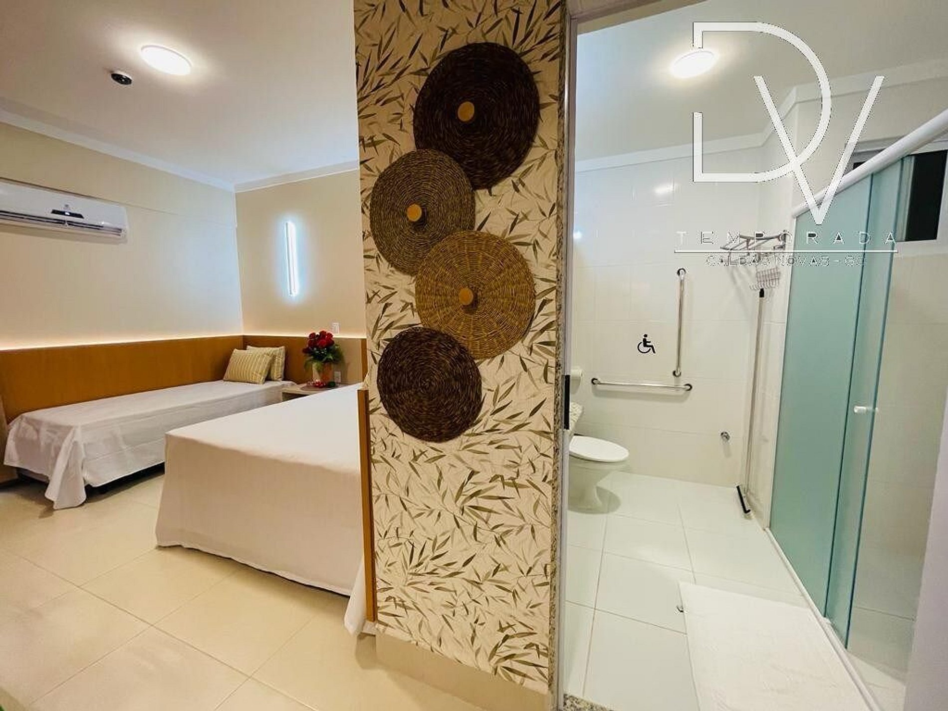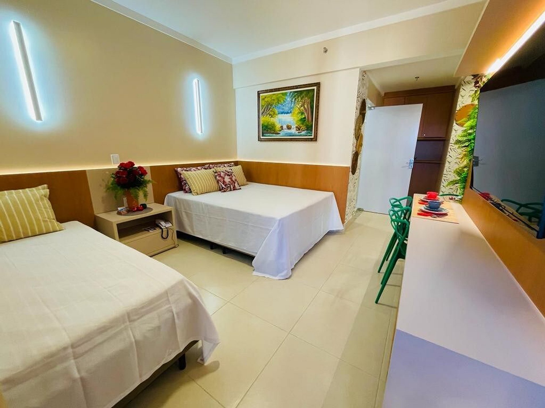 A acomodação oferece 1 cama de casal tamanho Queen, e 2 camas de solteiro sendo uma em cima e outra em baixo, banheiro privativo no quarto, refrigerador, micro-ondas, cofre, tv Smart 32¨.