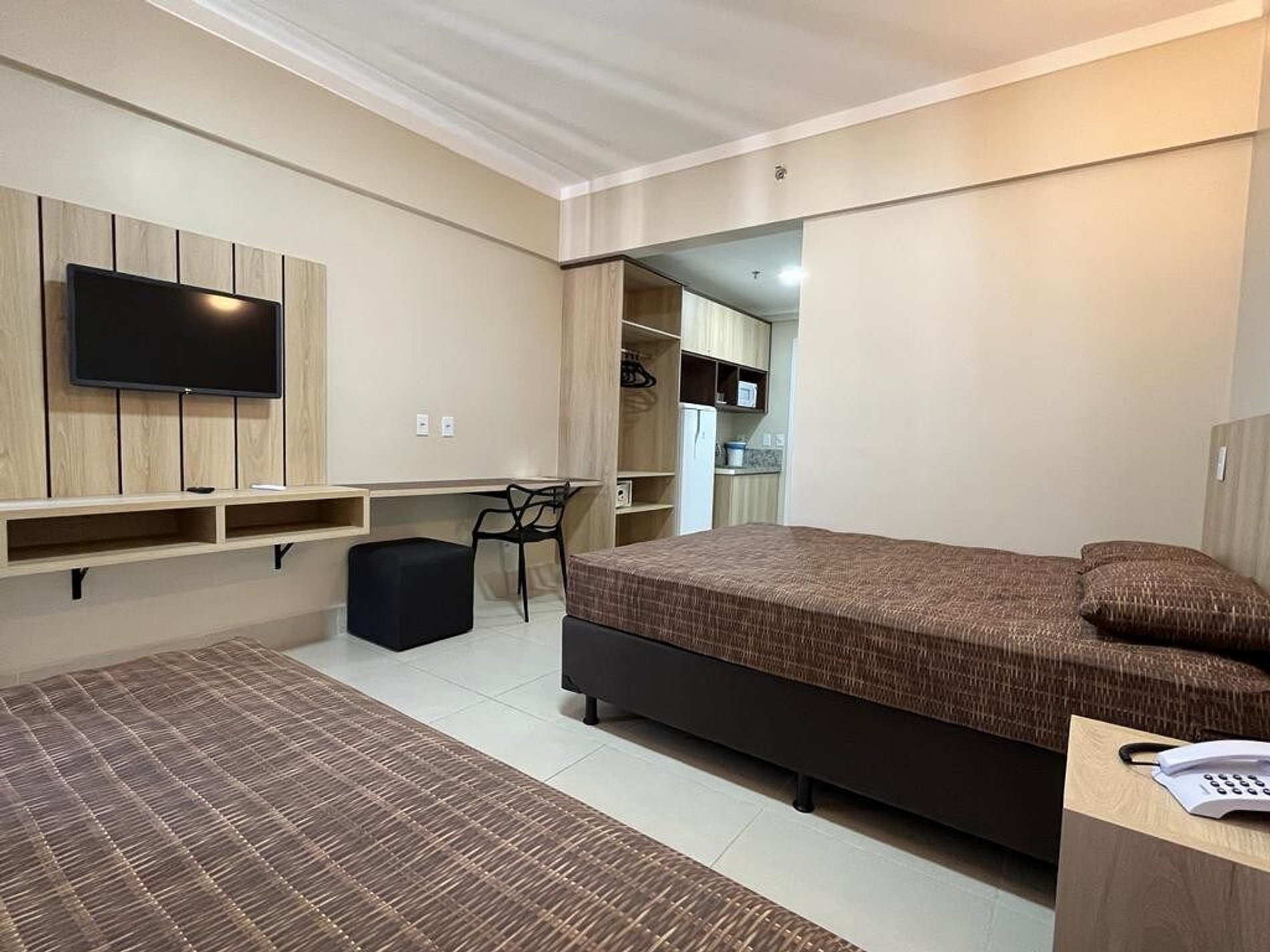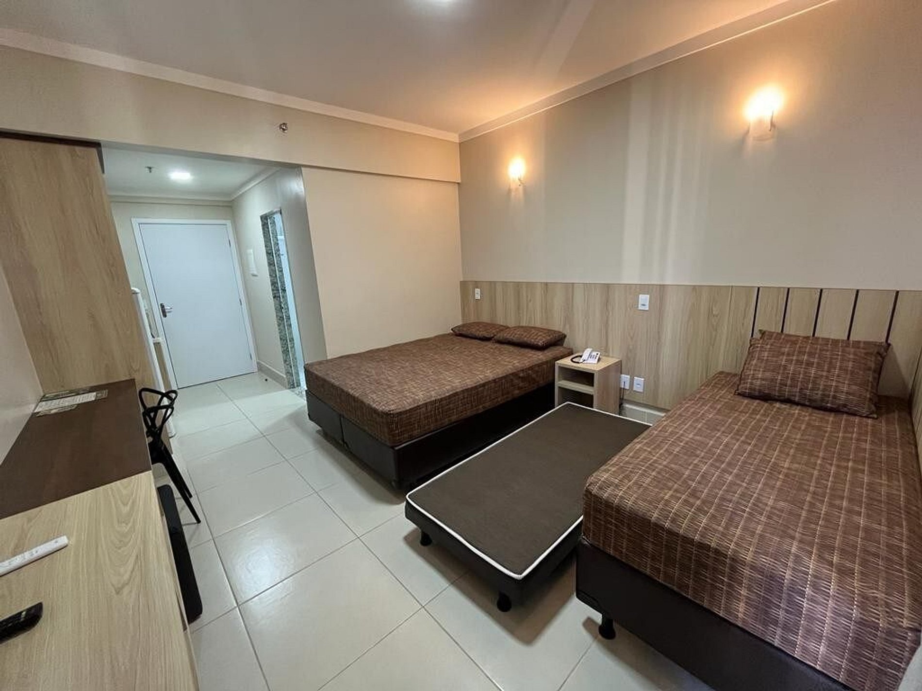 A acomodação oferece 1 cama de casal tamanho Queen, e 2 camas de solteiro sendo uma em cima e outra em baixo, banheiro privativo no quarto, refrigerador, micro-ondas, cofre, tv Smart 32¨.