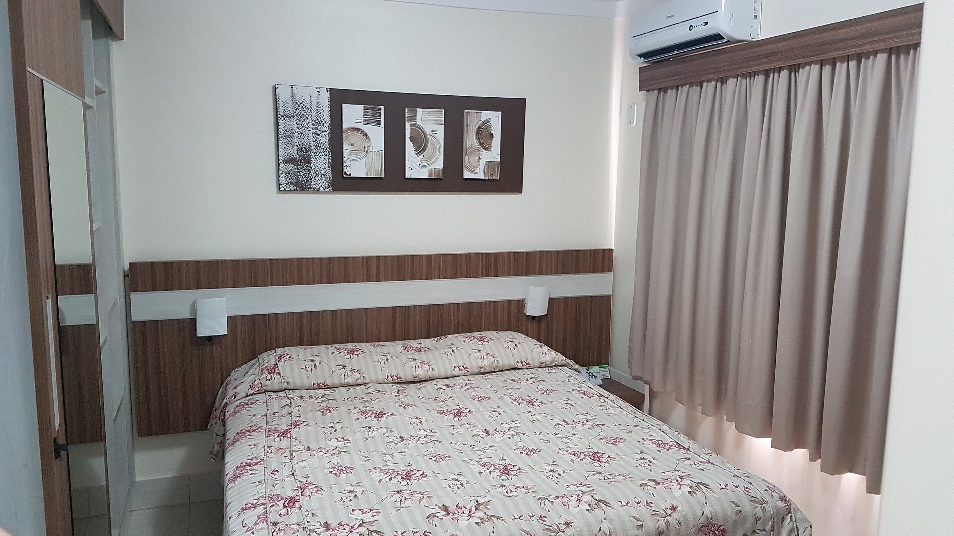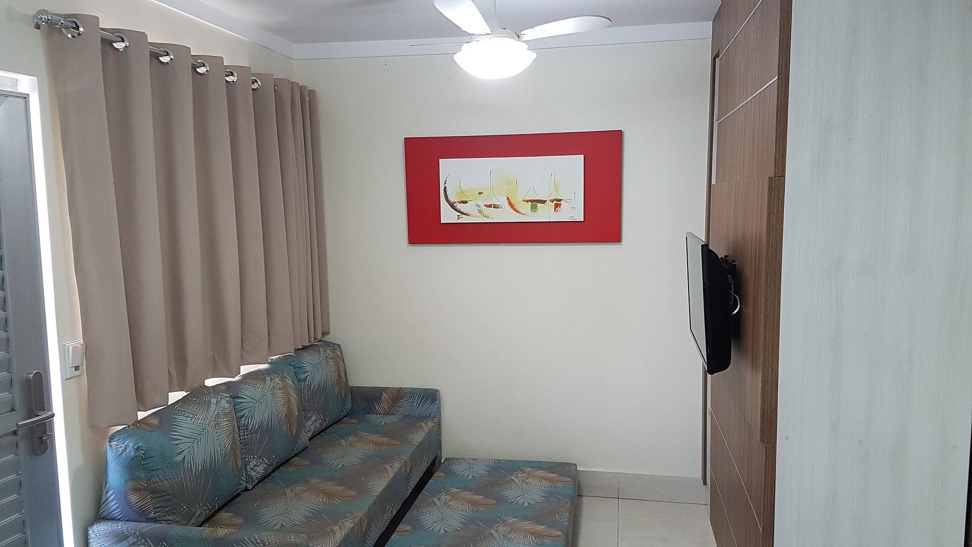 O apartamento conta com 1 cama de casa, ar condicionada no primeiro ambiente e um sofá-cama no segundo, tv de 32¨, uma mini cozinha com pia, frigobar, micro-ondas,