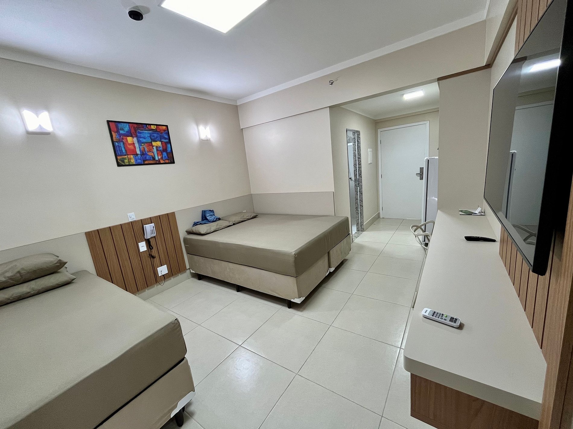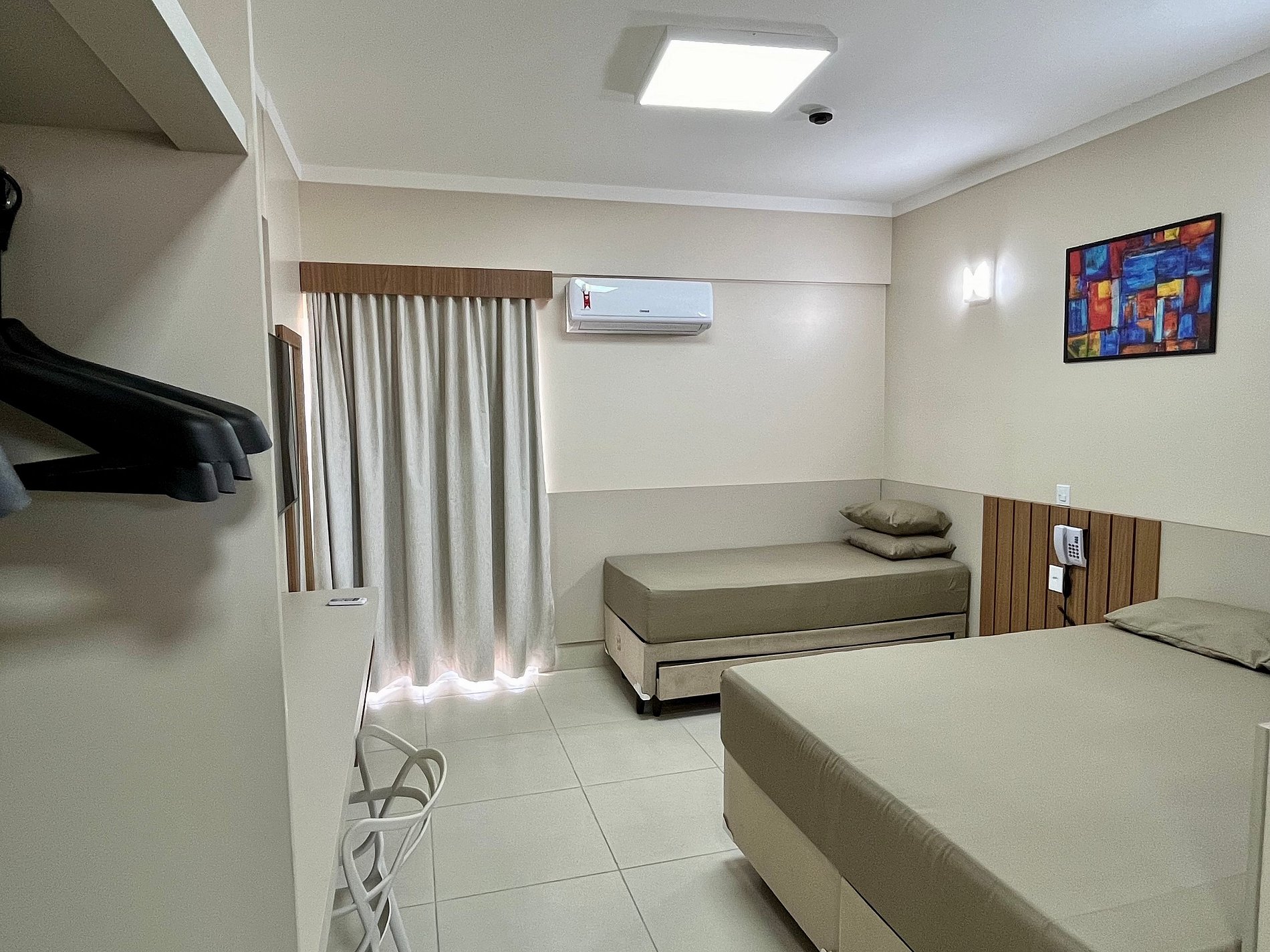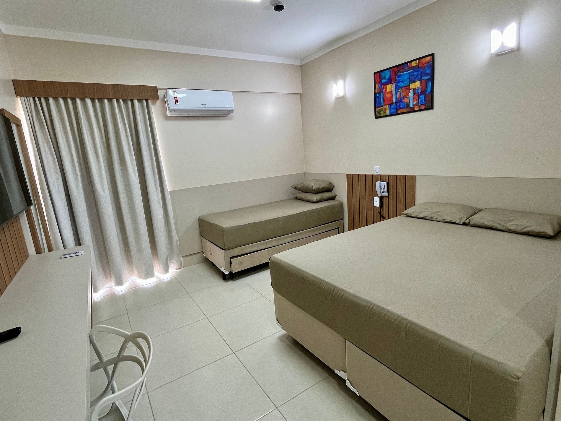 A acomodação oferece 1 cama de casal tamanho Queen, e 2 camas de solteiro sendo uma em cima e outra em baixo, banheiro privativo no quarto, refrigerador, micro-ondas, cofre, tv Smart 32¨.