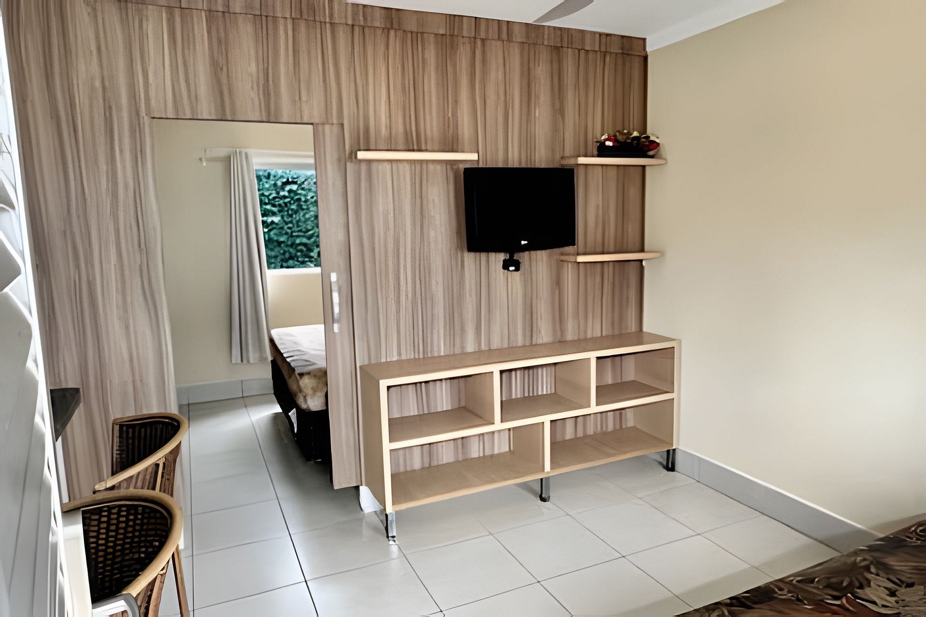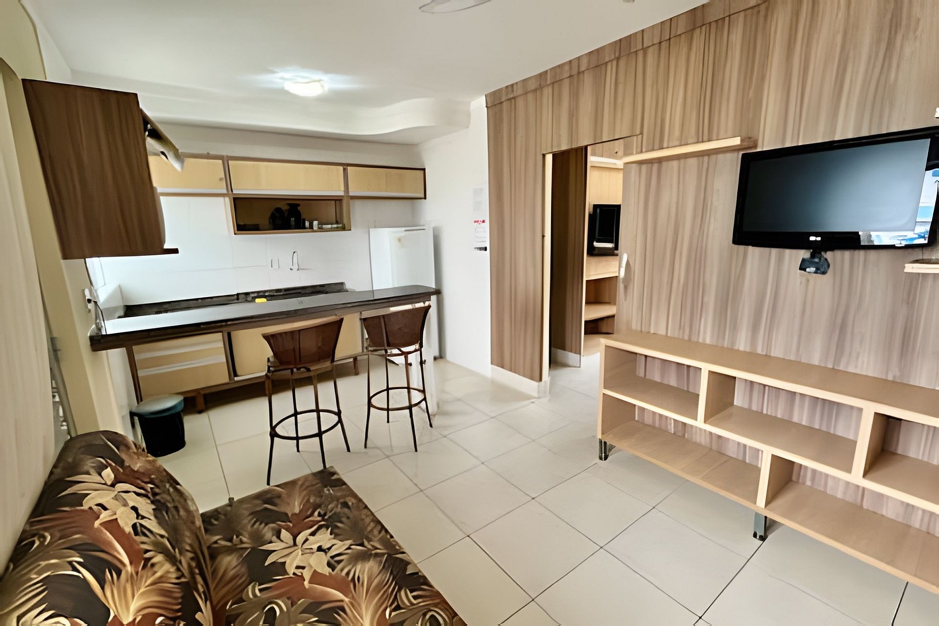 O apartamento conta com 1 cama de casa, ar condicionada no primeiro ambiente e um sofá-cama no segundo, tv de 32¨, uma mini cozinha com pia, frigobar, micro-ondas,